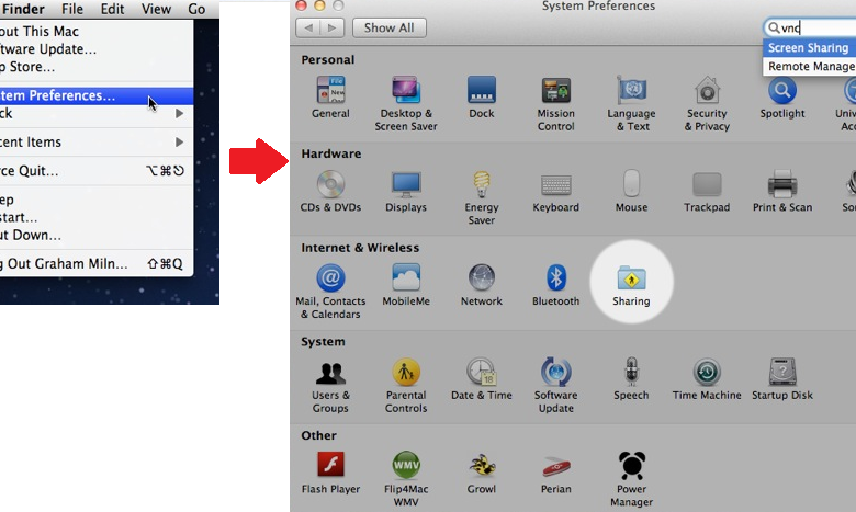 1. Navigate to the System Preferences of the target MacBook and then select the Sharing option.