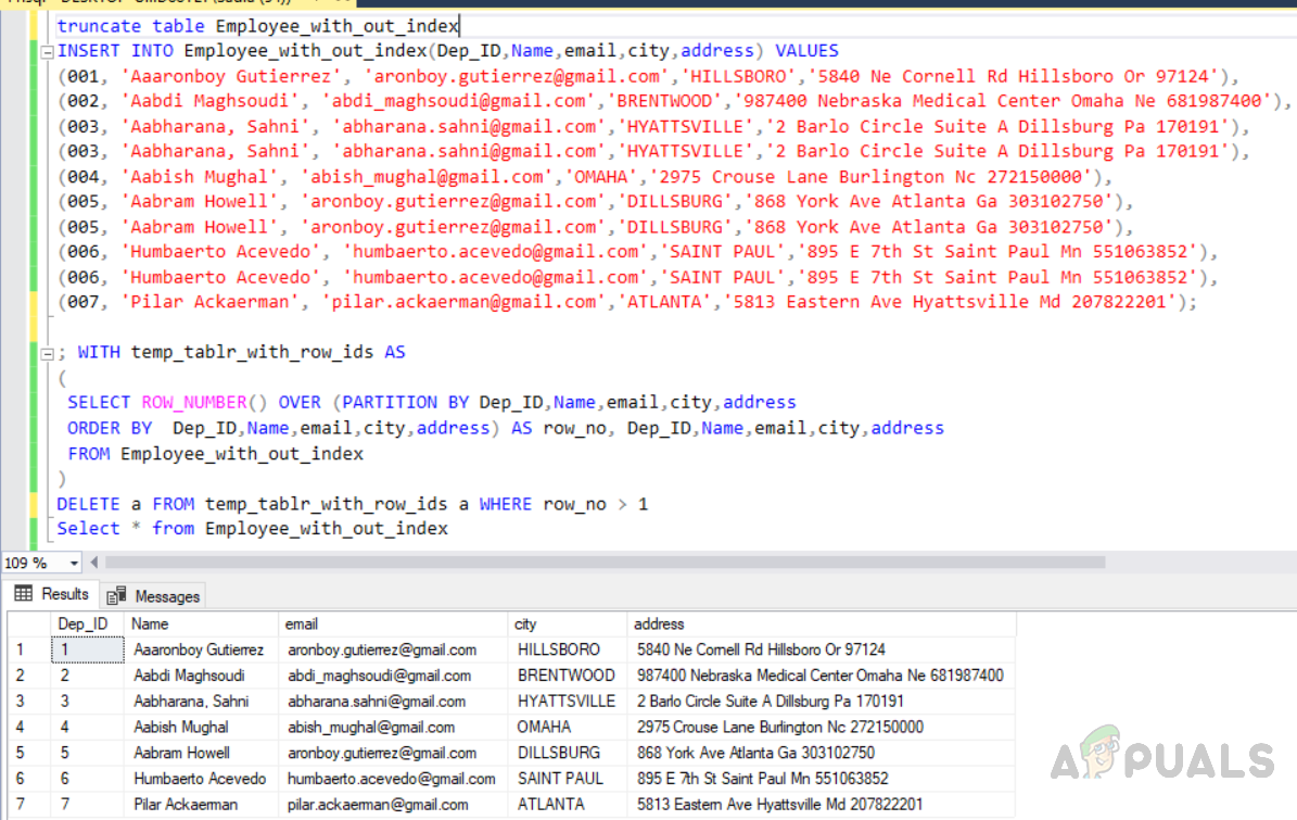 WITH temp_tablr_with_row_ids AS ( SELECT ROW_NUMBER() OVER (ORDER BY Dep_ID,Name,email,city,address) AS row_no, Dep_ID,Name,email,city,address FROM test_database.dbo.Employee_with_out_index ) DELETE a FROM temp_tablr_with_row_ids a WHERE row_no < (SELECT MAX(row_no) FROM temp_tablr_with_row_ids i WHERE a.Dep_ID=i.Dep_ID and a.Name=i.Name and a.email=i.email and a.city=i.city and a.address=i.address GROUP BY Dep_ID,Name,email,city,address)