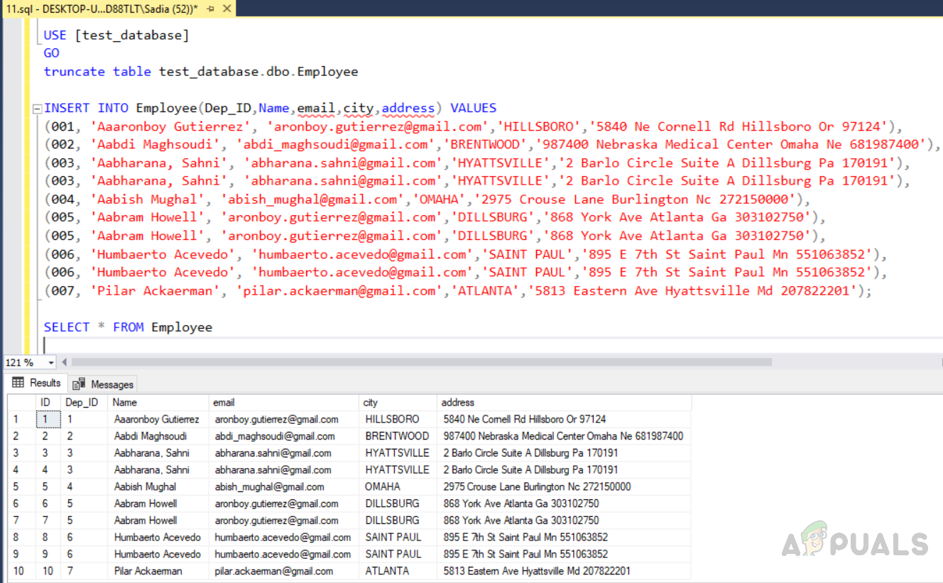 USE [test_database] GO truncate table test_database.dbo.Employee INSERT INTO Employee(Dep_ID,Name,email,city,address) VALUES (001, 'Aaaronboy Gutierrez', 'aronboy.gutierrez@gmail.com','HILLSBORO','5840 Ne Cornell Rd Hillsboro Or 97124'), (002, 'Aabdi Maghsoudi', 'abdi_maghsoudi@gmail.com','BRENTWOOD','987400 Nebraska Medical Center Omaha Ne 681987400'), (003, 'Aabharana, Sahni', 'abharana.sahni@gmail.com','HYATTSVILLE','2 Barlo Circle Suite A Dillsburg Pa 170191'), (003, 'Aabharana, Sahni', 'abharana.sahni@gmail.com','HYATTSVILLE','2 Barlo Circle Suite A Dillsburg Pa 170191'), (004, 'Aabish Mughal', 'abish_mughal@gmail.com','OMAHA','2975 Crouse Lane Burlington Nc 272150000'), (005, 'Aabram Howell', 'aronboy.gutierrez@gmail.com','DILLSBURG','868 York Ave Atlanta Ga 303102750'), (005, 'Aabram Howell', 'aronboy.gutierrez@gmail.com','DILLSBURG','868 York Ave Atlanta Ga 303102750'), (006, 'Humbaerto Acevedo', 'humbaerto.acevedo@gmail.com','SAINT PAUL','895 E 7th St Saint Paul Mn 551063852'), (006, 'Humbaerto Acevedo', 'humbaerto.acevedo@gmail.com','SAINT PAUL','895 E 7th St Saint Paul Mn 551063852'), (007, 'Pilar Ackaerman', 'pilar.ackaerman@gmail.com','ATLANTA','5813 Eastern Ave Hyattsville Md 207822201'); SELECT * FROM Employee