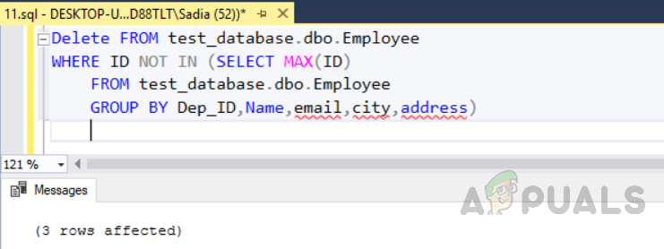 Delete FROM test_database.dbo.Employee WHERE ID NOT IN (SELECT MAX(ID) FROM test_database.dbo.Employee GROUP BY Dep_ID,Name,email,city,address)