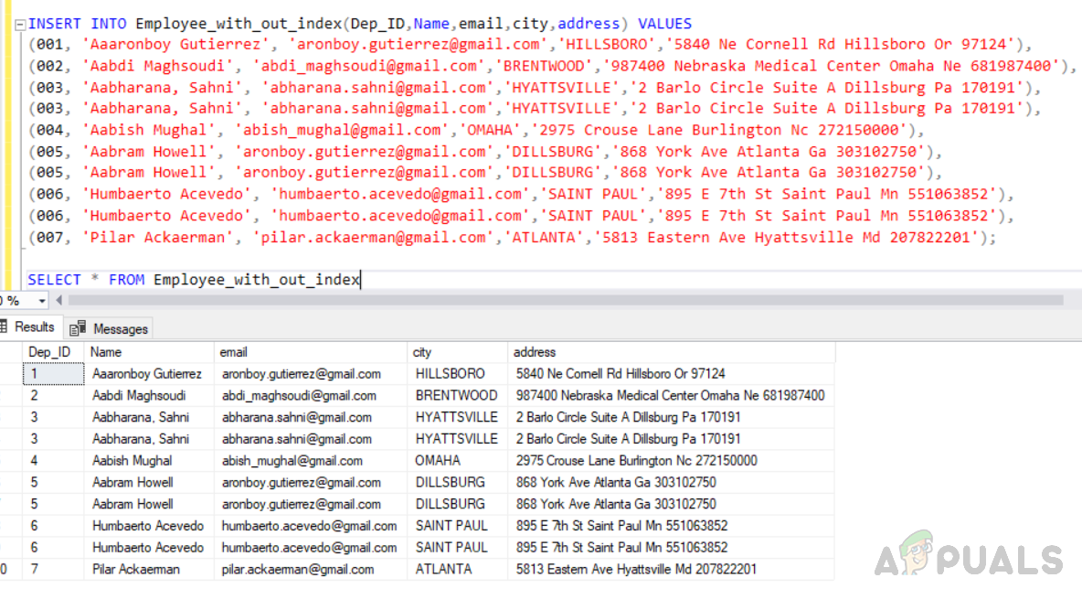 truncate table Employee_with_out_index INSERT INTO Employee_with_out_index(Dep_ID,Name,email,city,address) VALUES (001, 'Aaaronboy Gutierrez', 'aronboy.gutierrez@gmail.com','HILLSBORO','5840 Ne Cornell Rd Hillsboro Or 97124'), (002, 'Aabdi Maghsoudi', 'abdi_maghsoudi@gmail.com','BRENTWOOD','987400 Nebraska Medical Center Omaha Ne 681987400'), (003, 'Aabharana, Sahni', 'abharana.sahni@gmail.com','HYATTSVILLE','2 Barlo Circle Suite A Dillsburg Pa 170191'), (003, 'Aabharana, Sahni', 'abharana.sahni@gmail.com','HYATTSVILLE','2 Barlo Circle Suite A Dillsburg Pa 170191'), (004, 'Aabish Mughal', 'abish_mughal@gmail.com','OMAHA','2975 Crouse Lane Burlington Nc 272150000'), (005, 'Aabram Howell', 'aronboy.gutierrez@gmail.com','DILLSBURG','868 York Ave Atlanta Ga 303102750'), (005, 'Aabram Howell', 'aronboy.gutierrez@gmail.com','DILLSBURG','868 York Ave Atlanta Ga 303102750'), (006, 'Humbaerto Acevedo', 'humbaerto.acevedo@gmail.com','SAINT PAUL','895 E 7th St Saint Paul Mn 551063852'), (006, 'Humbaerto Acevedo', 'humbaerto.acevedo@gmail.com','SAINT PAUL','895 E 7th St Saint Paul Mn 551063852'), (007, 'Pilar Ackaerman', 'pilar.ackaerman@gmail.com','ATLANTA','5813 Eastern Ave Hyattsville Md 207822201');