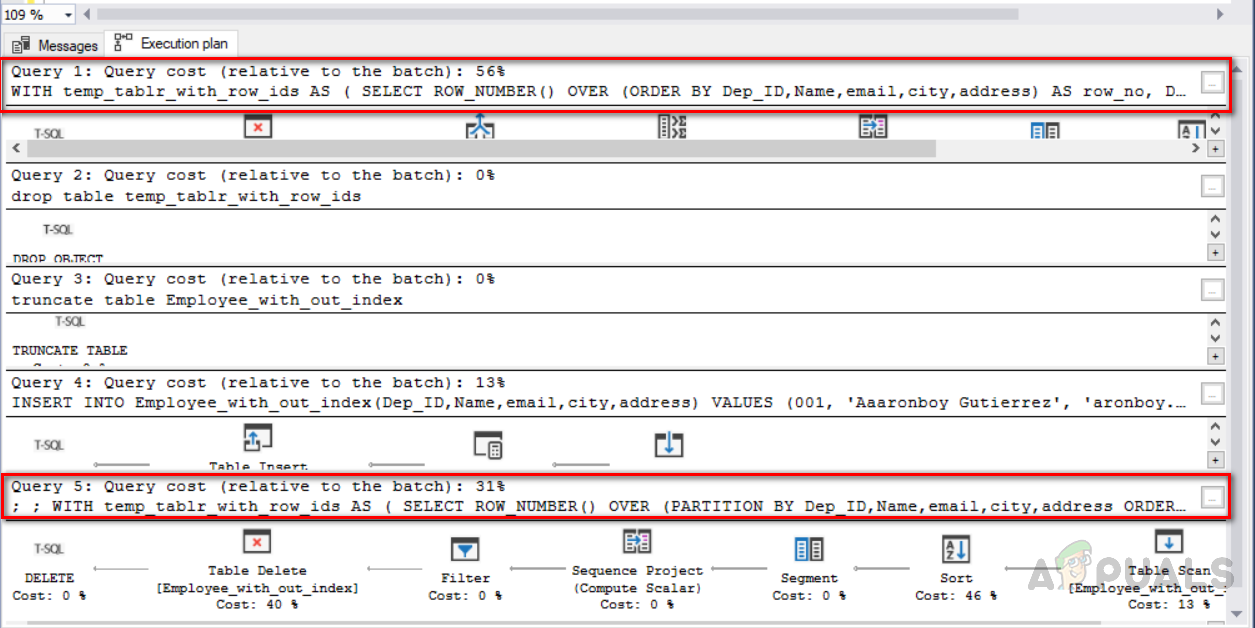 Furthermore, we need to know about query execution costs in order to understand which one is an optimized solution. So you need to select all the relevant queries and click on the execution plan. The image below shows the execution plan for the queries along with execution cost. Delete queries are highlighted in the red box. The first query which is using “ROW_NUMBER ()” and JOIN clause has 56% execution cost, whereas the second query is using “ROW_NUMBER ()” and “PARTITION BY” has 31% cost. So the second method is a more optimized one and we should follow an optimized solution.