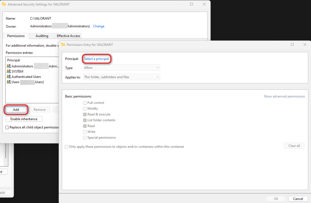 - Click Add (if you’re not listed), then Select a principal. Type your user or group, click Check Names, and press OK.