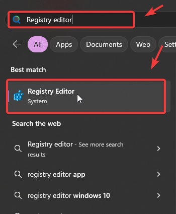 - Click the Start Menu and type Registry Editor. Press Enter to open the Registry Editor.