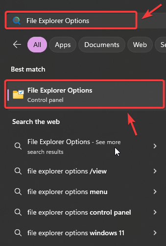 - Click the Start Menu and type File Explorer Options in the search bar.