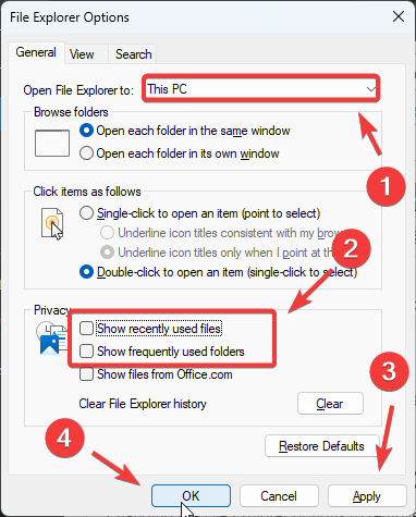 - Below that, uncheck both Show recently used files in Quick access and Show frequently used folders in Quick access.