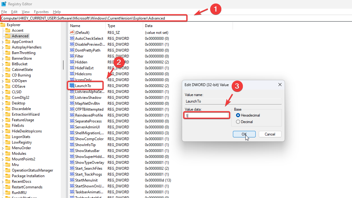- In the right pane, find the entry named LaunchTo. Right-click on it and select Modify.