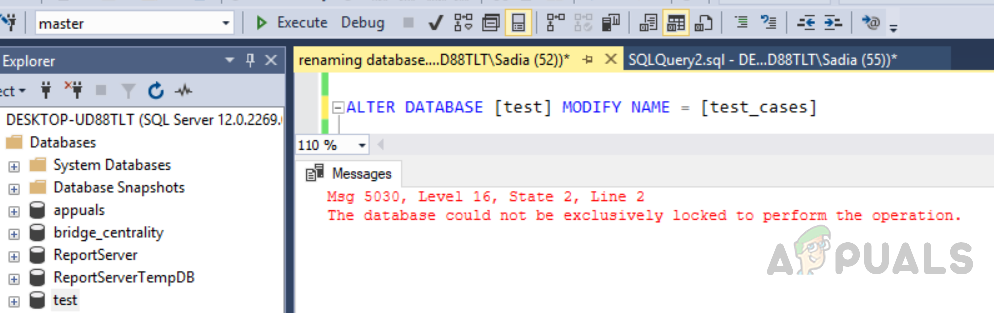 Furthermore, we will discuss errors that may arise while renaming the database. You will need exclusive access to the database to rename the database, which ensures that the database does not have any other database connections. But if this is not the case, it can result in errors as shown below. The error can even arise when we accidentally open another window with the same database name which has to be renamed.