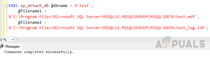 EXEC sp_attach_db @dbname = N'test', @filename1 = N'C:\Program Files\Microsoft SQL Server\MSSQL12.MSSQLSERVER\MSSQL\DATA\test.mdf', @filename2 = N'C:\Program Files\Microsoft SQL Server\MSSQL12.MSSQLSERVER\MSSQL\DATA\test_log.ldf';