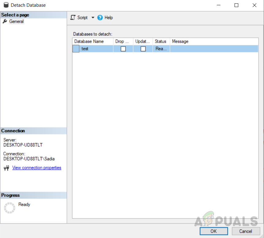 - Right-click the database, select “task” then click on “Detach”