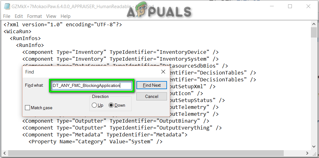 - Press Ctrl + F. After that, type ‘DT_ANY_FMC_BlockingApplication’ to look for the value that is ‘True’.