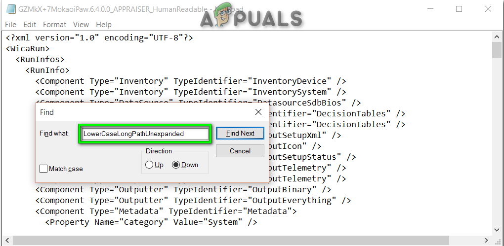 - Press Ctrl + F. Type ‘LowerCaseLongPathUnexpanded’ to look for the file path. (File that should be deleted or moved to another location)