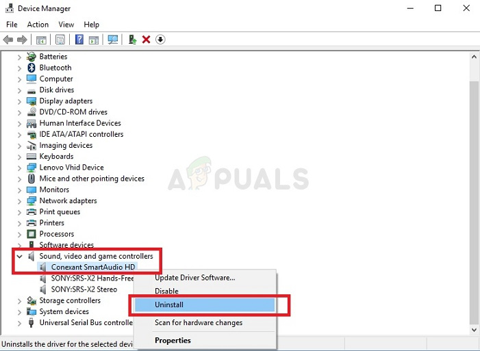 Uninstalling Conexant Audio - Confirm the uninstallation but don’t check “Delete the driver software for this device.”