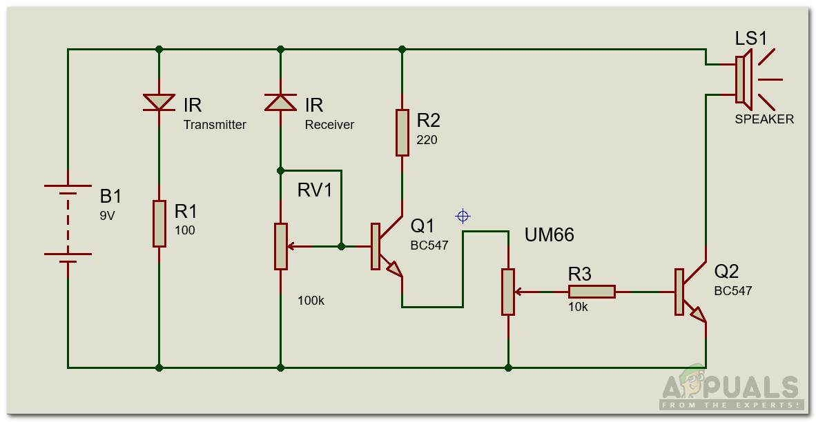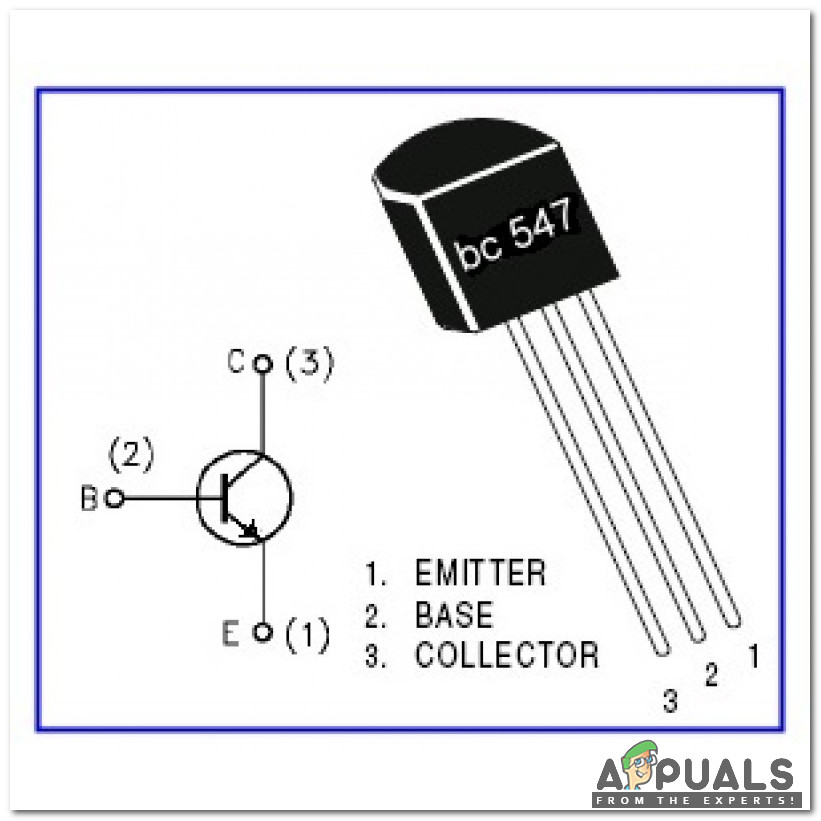 As we have run the simulation no we are in a position to make a prototype. While soldering the components on the Vero board pay special attention towards BC 547 transistor and UM 66 IC. UM 66 IC is used to create a melody when someone comes in front of 100k preset. BC 547 has three legs known as Emitter, Base, and Collector. The collector is connected to a 220-ohm resistor, the base is connected to a 100k preset and emitter is connected to UM 66 IC. The pin configuration of the BC 547 transistor is shown below :
