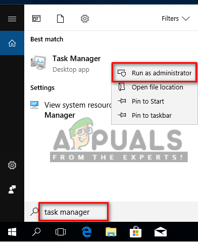 Opening Task Manager as an administrator from the start menu - Type the password for the administrator when prompted by the UAC (User Account Control) and it will open Task Manager as administrator.