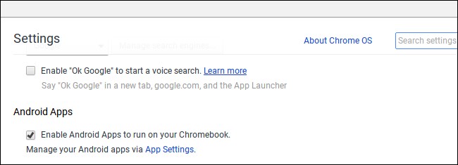 Now apps from “Unknown Sources” can be enabled by opening the Chrome OS settings screen, finding the “App Settings” link under Android Apps, and clicking on it.