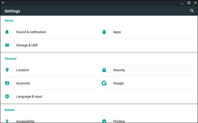 A new window will open showing Android’s Settings screen on your Chromebook. Click or tap the “Security” option.