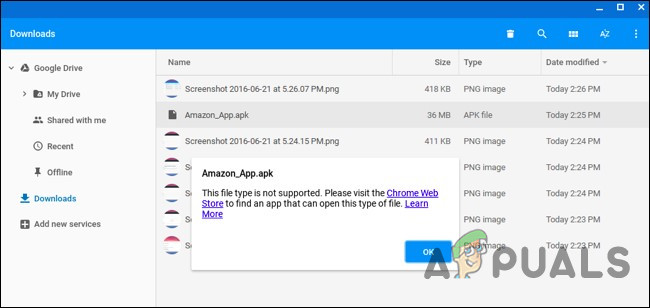You might expect that you can simply double-click or load an APK file from Chrome’s Files application, but that doesn’t work. You’ll just see an error message saying “This file type is not supported.”