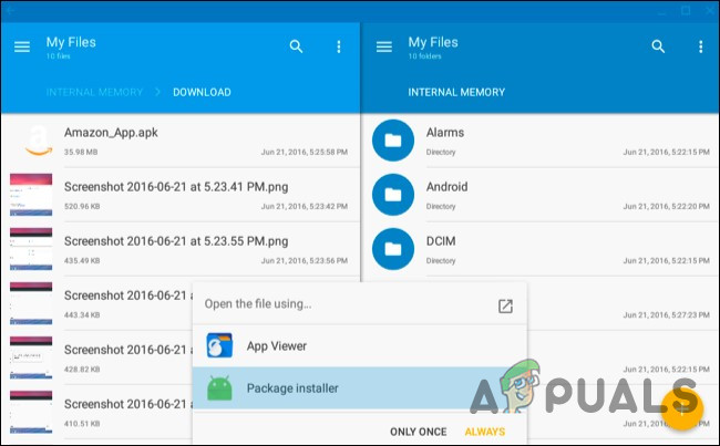 Open your downloaded file manager app, open your “Download” folder through this app, and open the APK file. Select the “Package Installer” option on the app, and you’ll be asked to install the APK.
