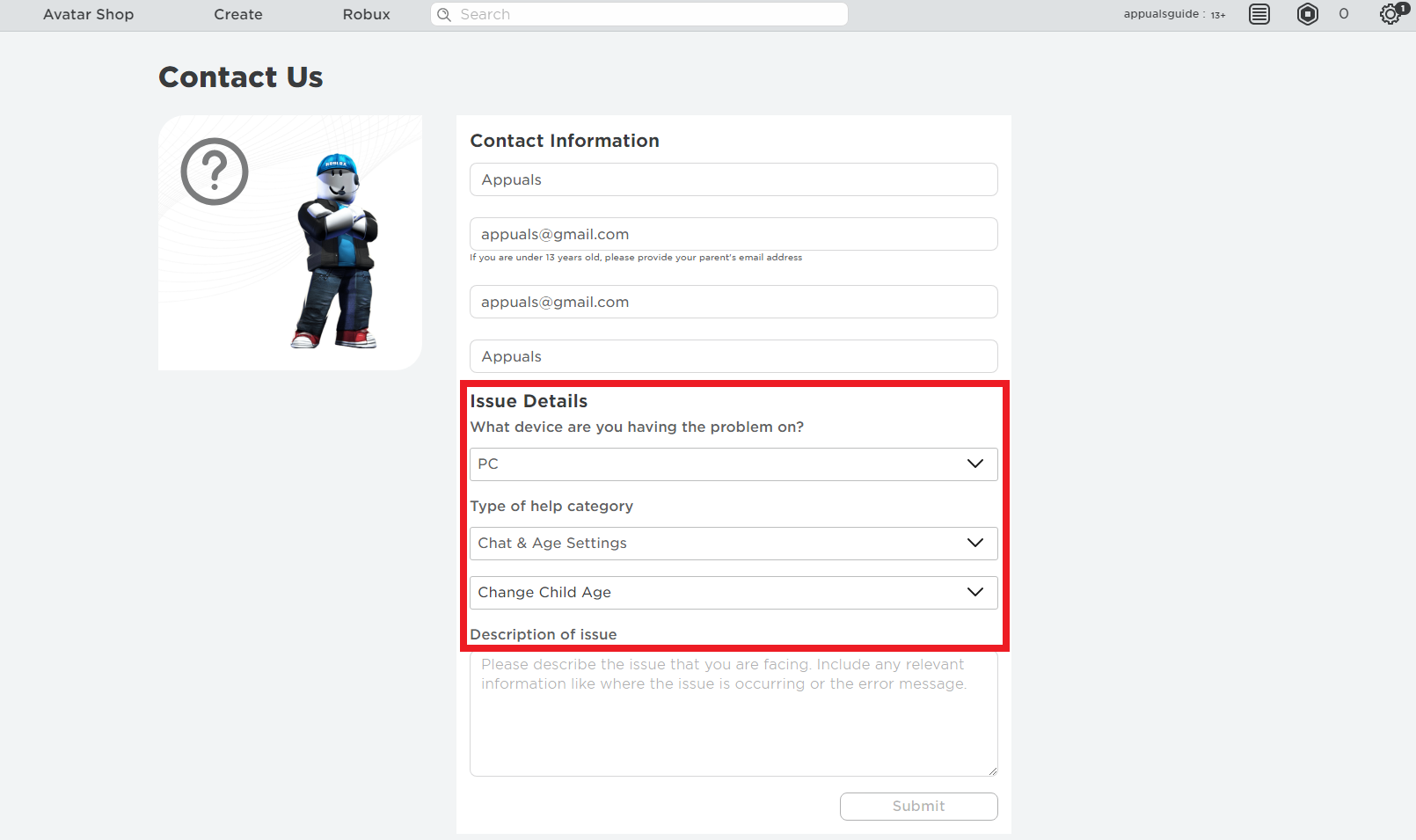 Asking Roblox To Change Account Age - Under Description of the issue, you have to come up with a proper reason. In case your age is wrongly entered, then you will have to convince them about change. If I were you, I’d go about it like this.