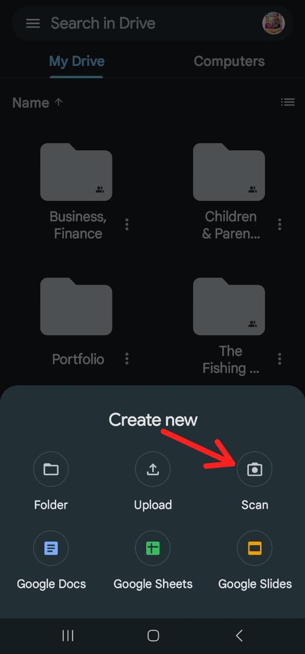 Scan Documents on Android Using Google Drive by clicking plus sign - In the Create New menu, select “Scan” from the options.