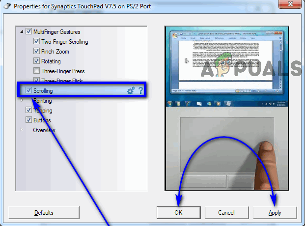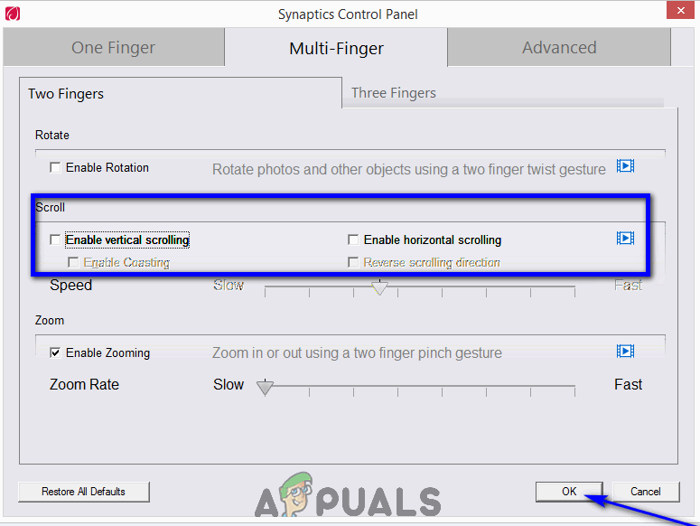 - If you’re using Windows 7, check the checkbox next to the Scrolling option, and click on Apply and then on OK. If you’re using Windows 8, 8.1 or 10, navigate to the Multi-Finger tab, check the checkboxes next to the Enable vertical scrolling and Enable horizontal scrolling options, and click on OK.