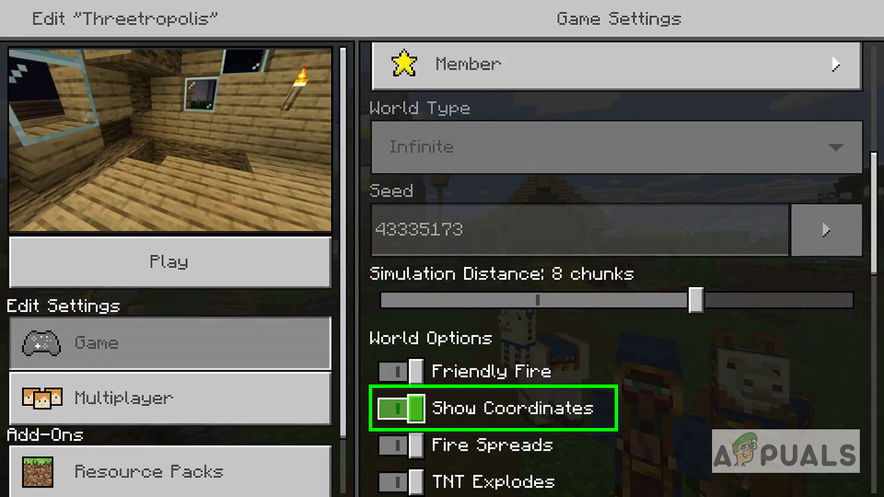 Click on the Show Coordinates option - Now click on Play, the game will load back in and you should be able to see the coordinates on the top-left of the screen.