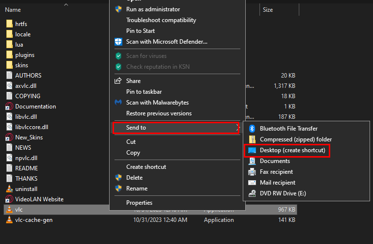 - Right-click vlc.exe and select Send to > Desktop (create shortcut).
