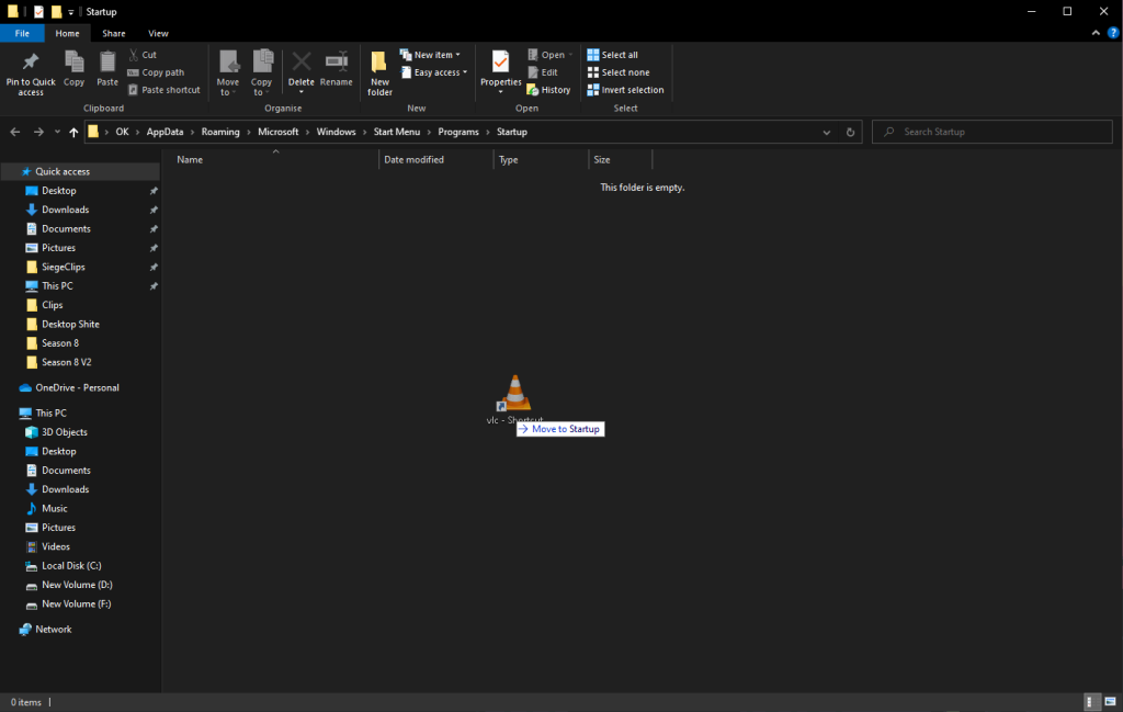 - Drag the VLC Media Player shortcut from the desktop to the Startup folder.