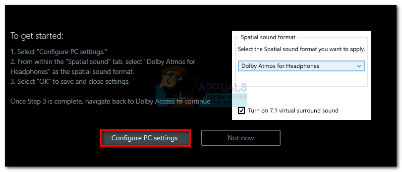 - Once you’ve set the Atmos-powered theater as the default, return to the Dolby Access app and click on Configure PC settings.
