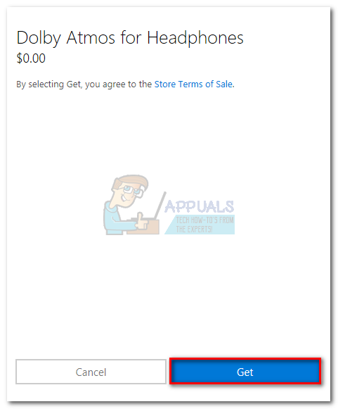 Note: If the 30-day trial button is not available, you have already used the Dolby Access trial with this particular Microsoft account. - If you opt for the 30-day trial, you’ll be presented with a Microsoft Store Window. Hit Get to agree with Microsoft’s ToS.