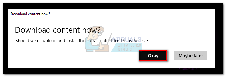 Note: This won’t automatically draw money from your credit card at the end of the trial period. - Upon returning to the Dolby Access window, you will be prompted to download additional content for the app. Hit Okay and wait for the download to complete.