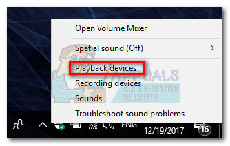 - Then, we need to make sure that the Atmos-enabled system is set as the default device. Do this by right-clicking on the sound icon (bottom-right corner) and select Playback Devices.