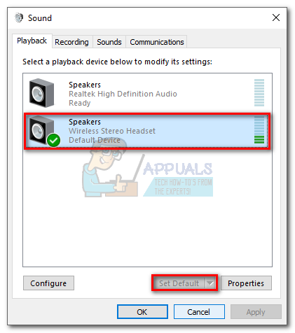 Note: If the headset is not already the default playback choice, you’ll need to right-click on the sound icon located on your taskbar (bottom-right corner) and select Playback Devices. Once there, make sure that it’s the default choice. If it’s not, select it and hit the Set as Default button.