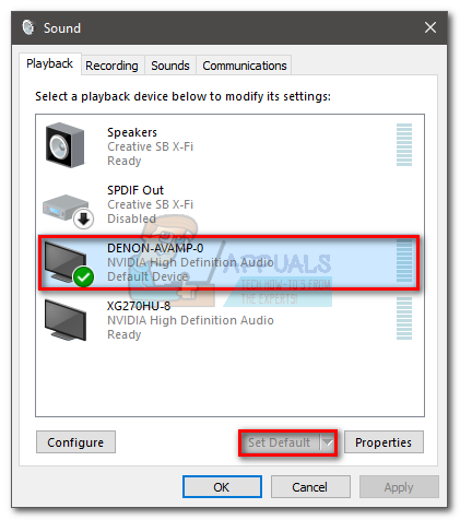 - Check whether the Atmos HDMI playback device is set as the default. If it’s not, select it and click the Set as Default button.