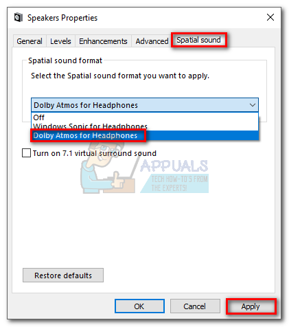 - Next, use the drop-down menu under Spatial sound format to select Dolby Atmos for home theater and hit Apply to confirm.