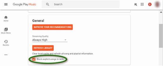 - Check the checkbox corresponding to the field saying, Block Explicit Songs in Radio. Doing this will prevent Google Play Music to play any unauthorized content.