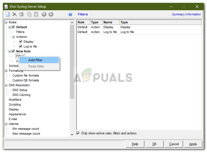 - Now, one of the first things you need to do when you install a syslog server is to set up filters and actions. Press Ctrl + P or simply click File > Setup to get the setup window.
