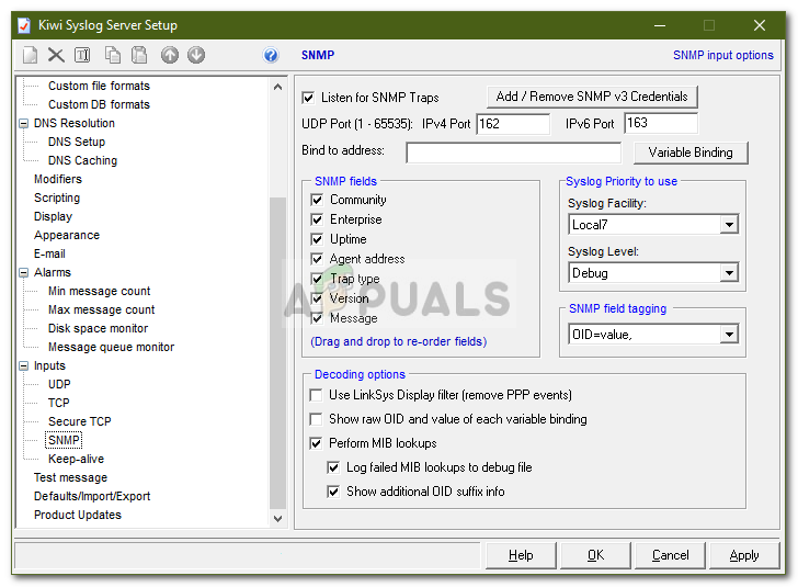 - You can make the utility listen for SNMP traps by going to SNMP under Inputs.