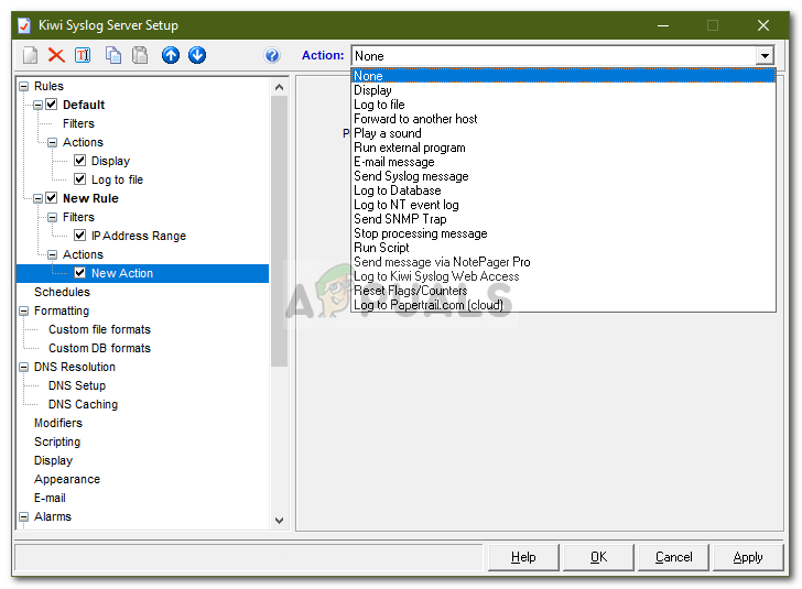 Choosing Filter Type - After that, you have Actions. Actions basically tell the server what to do when a specific Filter has been met. It can display the received messages, store them in a log file, play a sound etc. However, in the free edition, there are limitations to the actions that you can perform. To set an action, highlight Actions, right-click and select Add action.