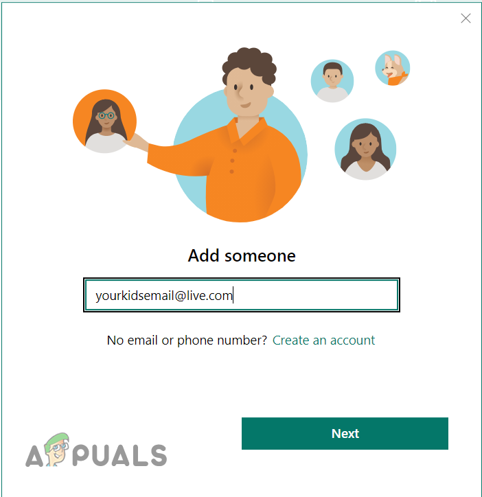 In the final box, type in the email address for your kid’s Microsoft account. If your child doesn’t have one, you can create a new Microsoft account for them by clicking on the link directly below the email address box.