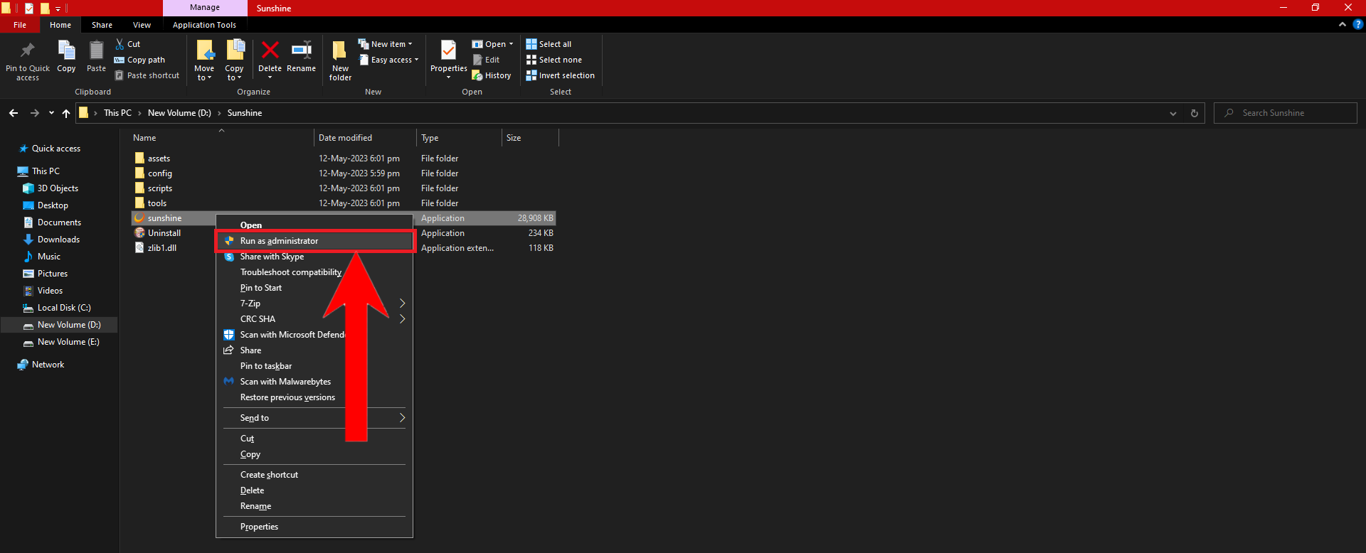 - Open up File Explorer and navigate to where you installed Sunshine. Right-click on the Sunshine app and select Run as administrator.