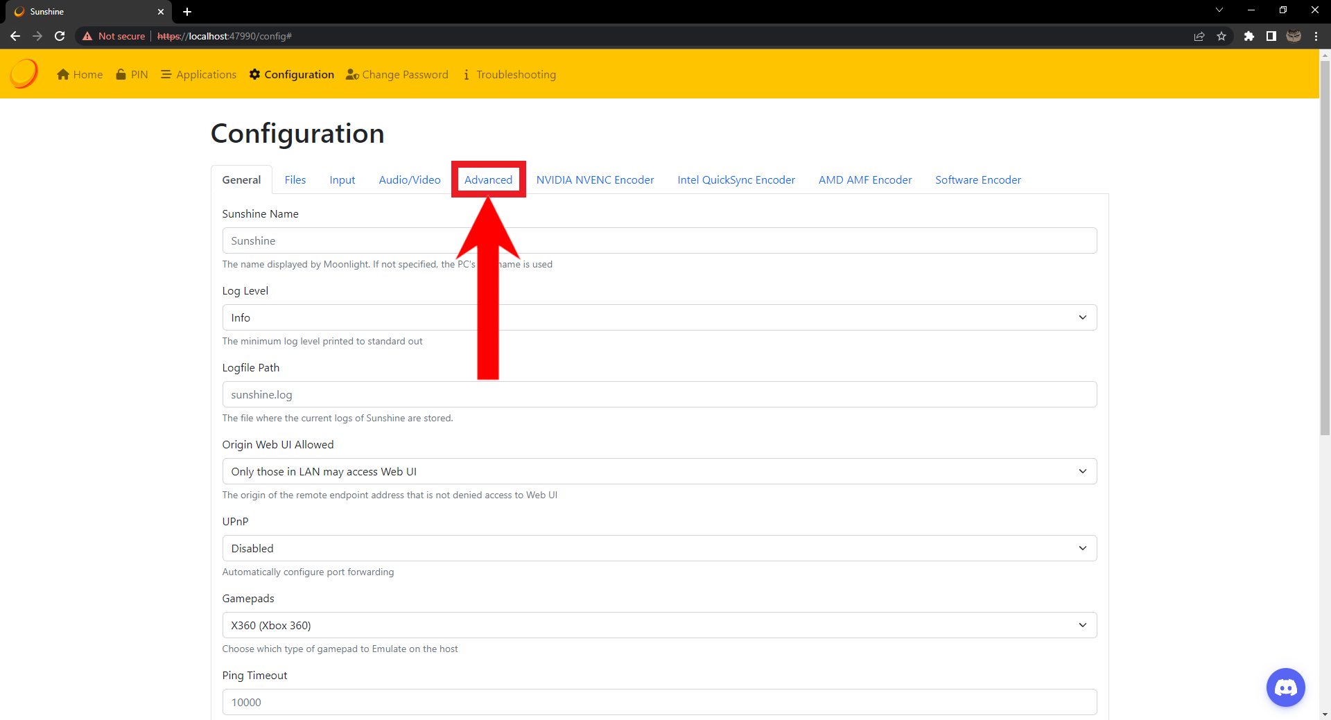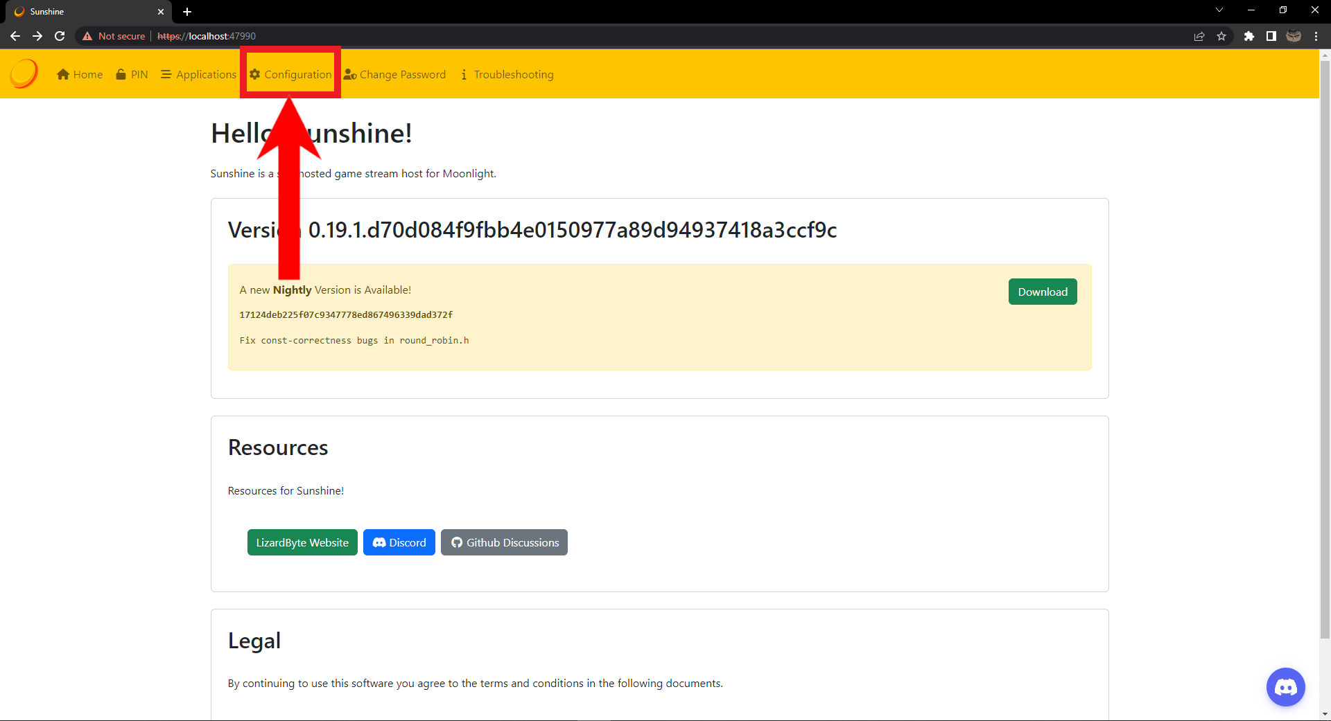 Your Sunshine web UI should open. Click on Configuration.