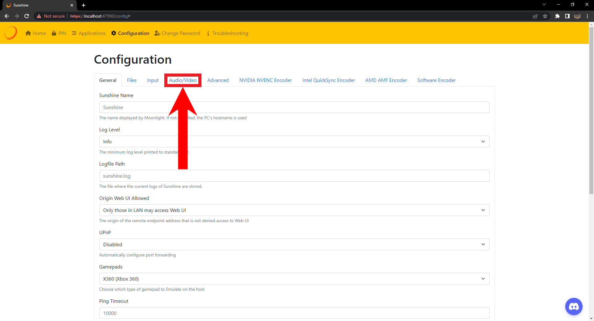 - To configure Sunshine’s audio and video settings, click on the Audio/Video tab in the Configuration section.