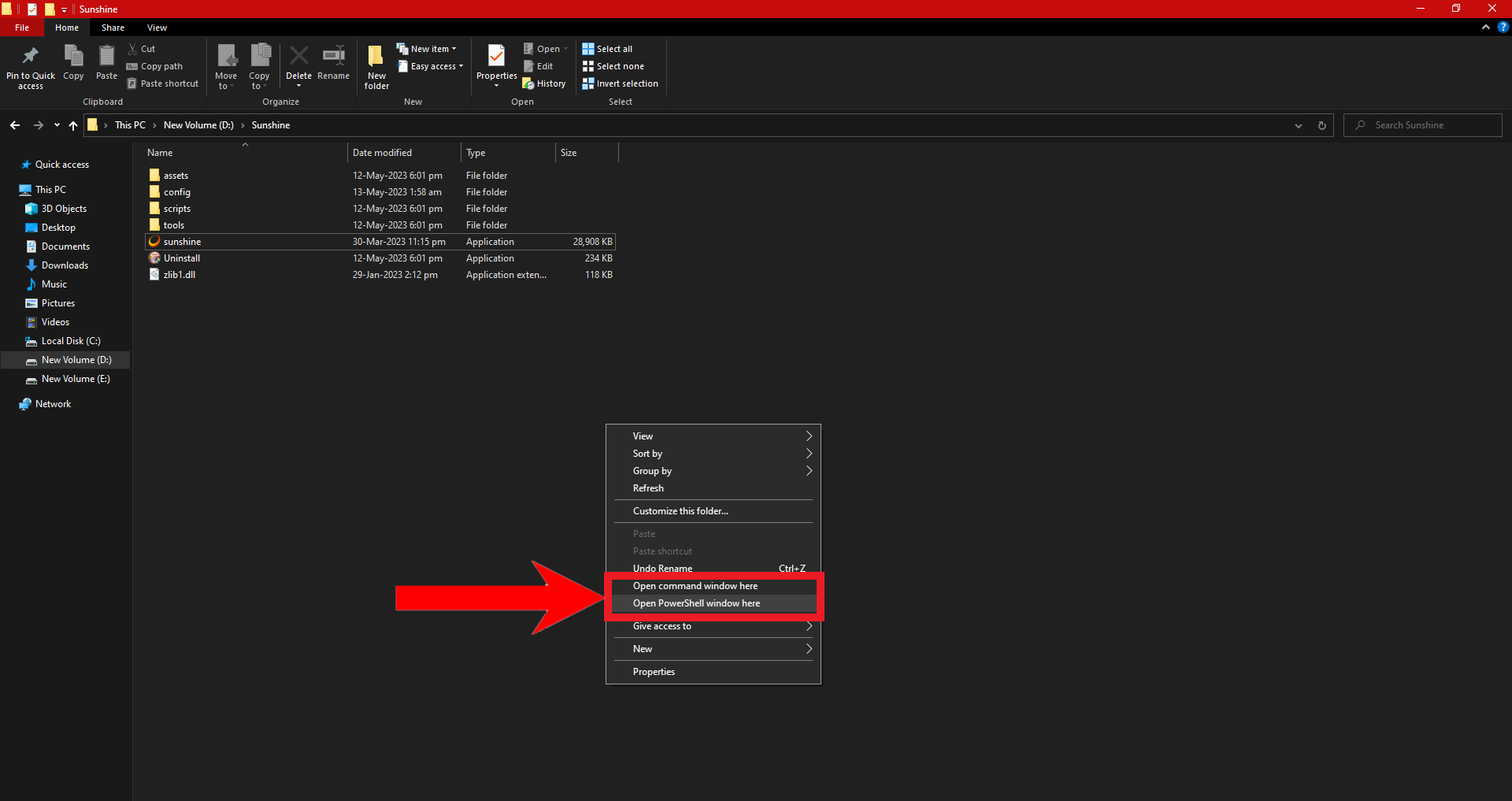 - Go to your Sunhine root folder, right-click while holding Shift and select “Open a Powershell window here.”