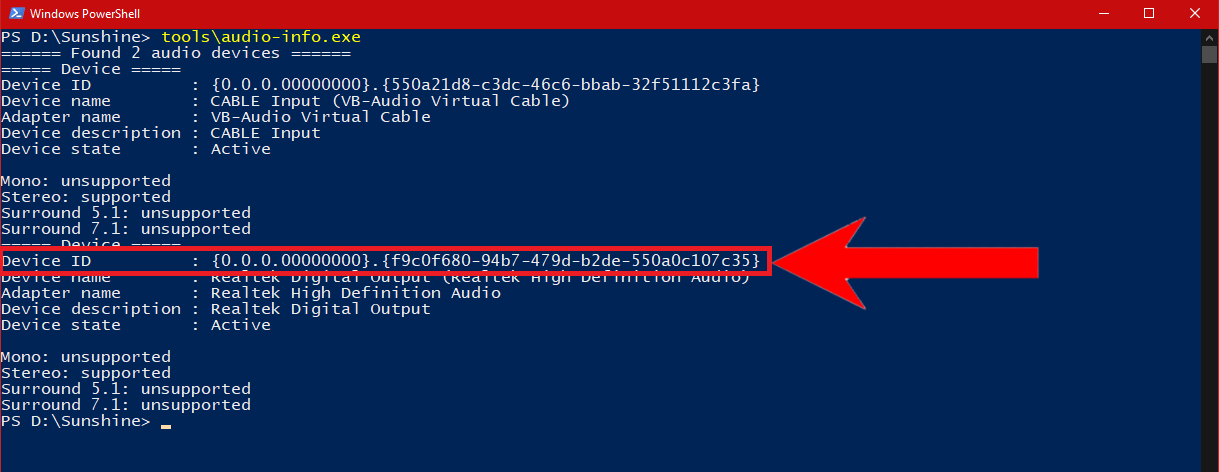 Paste the command and run it - Upon running the command, it should display your audio output devices. Each device will be accompanied by Device ID. Copy your desired device’s ID by highlighting it with the cursor and pressing Ctrl+C or right-clicking.