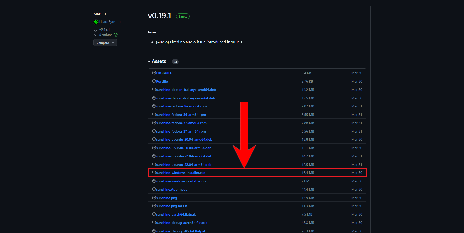 - Go to the latest releases section on GitHub. From the list of setup files here, download the one marked in the photo below.