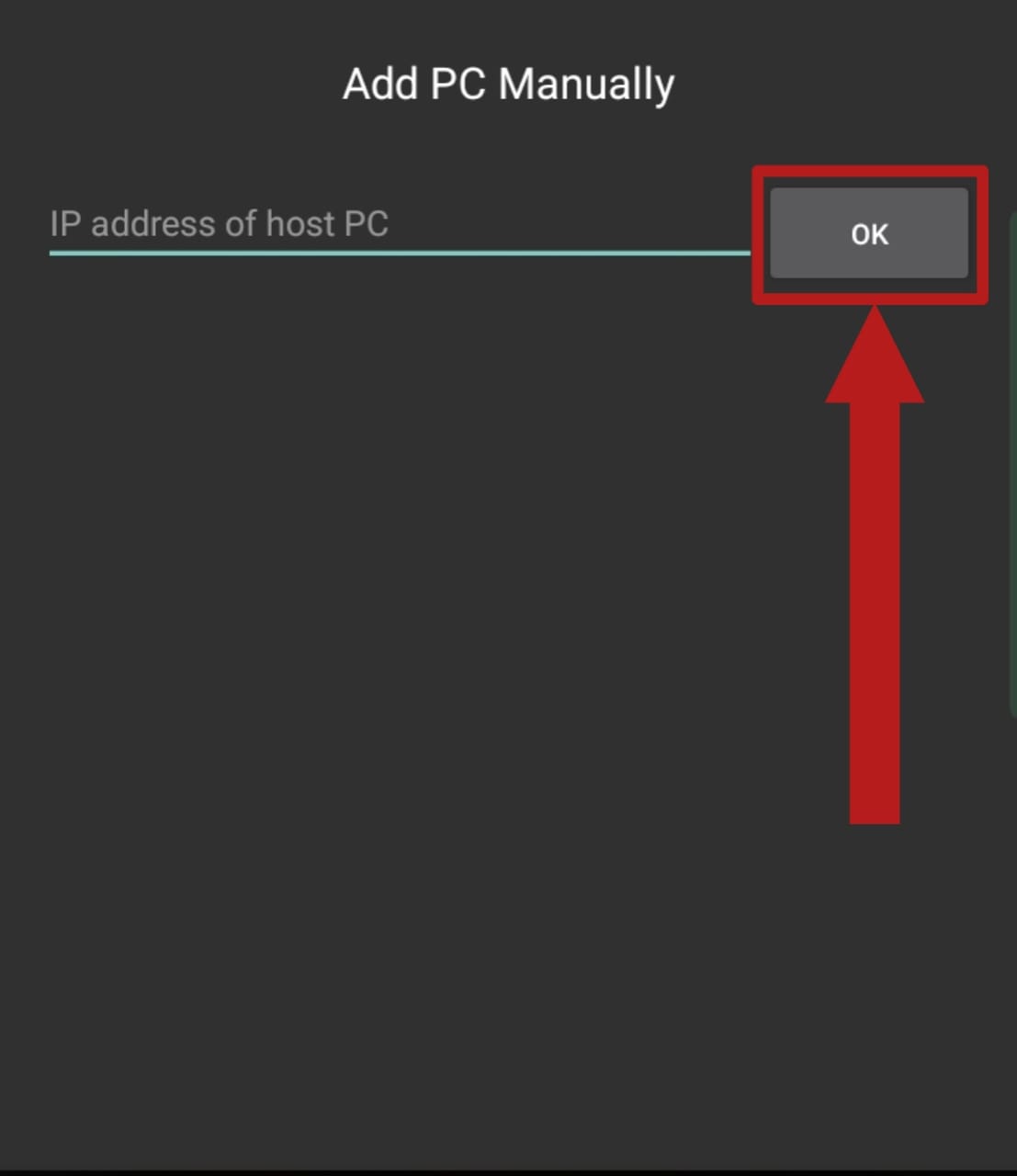 Press the plus icon on the top-right corner - Consequently, it will ask you to enter the IP address of your PC. Enter the IP address we instructed you to copy previously and tap OK.