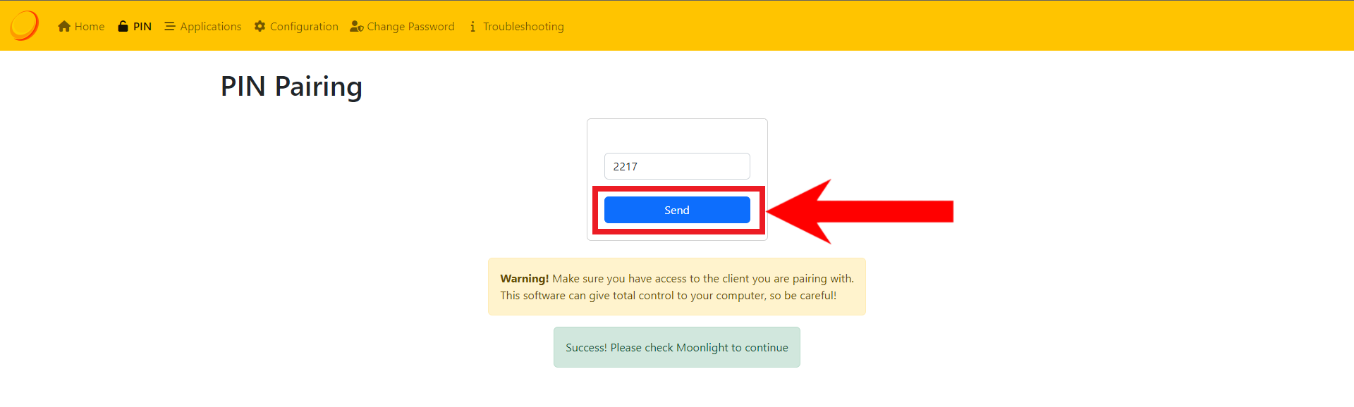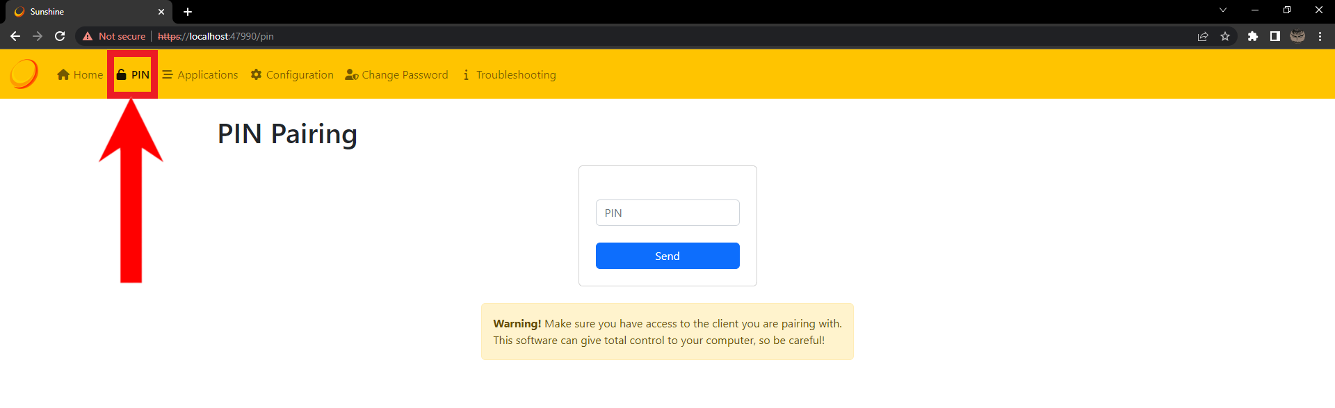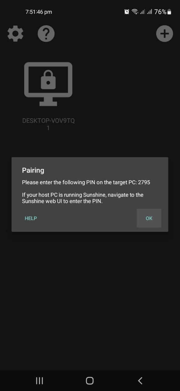 Select your PC - Next, it will display a PIN and instruct you to enter it on the web UI of Sunshine. On your host PC, open the Sunshine web UI as you did previously.