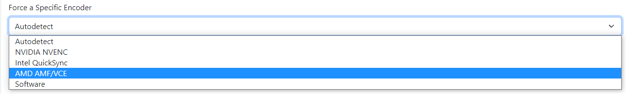 Click on it to open the drop-down menu - From the drop-down menu, choose the encoding based on the GPU you are using. If it’s an AMD GPU; choose AMD AMF/VCE. If it’s a NVIDIA GPU; choose NVIDIA NVENC. For Intel GPUs; Intel QuickSync.